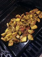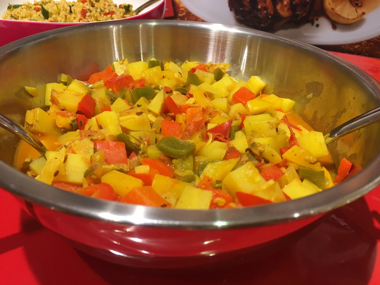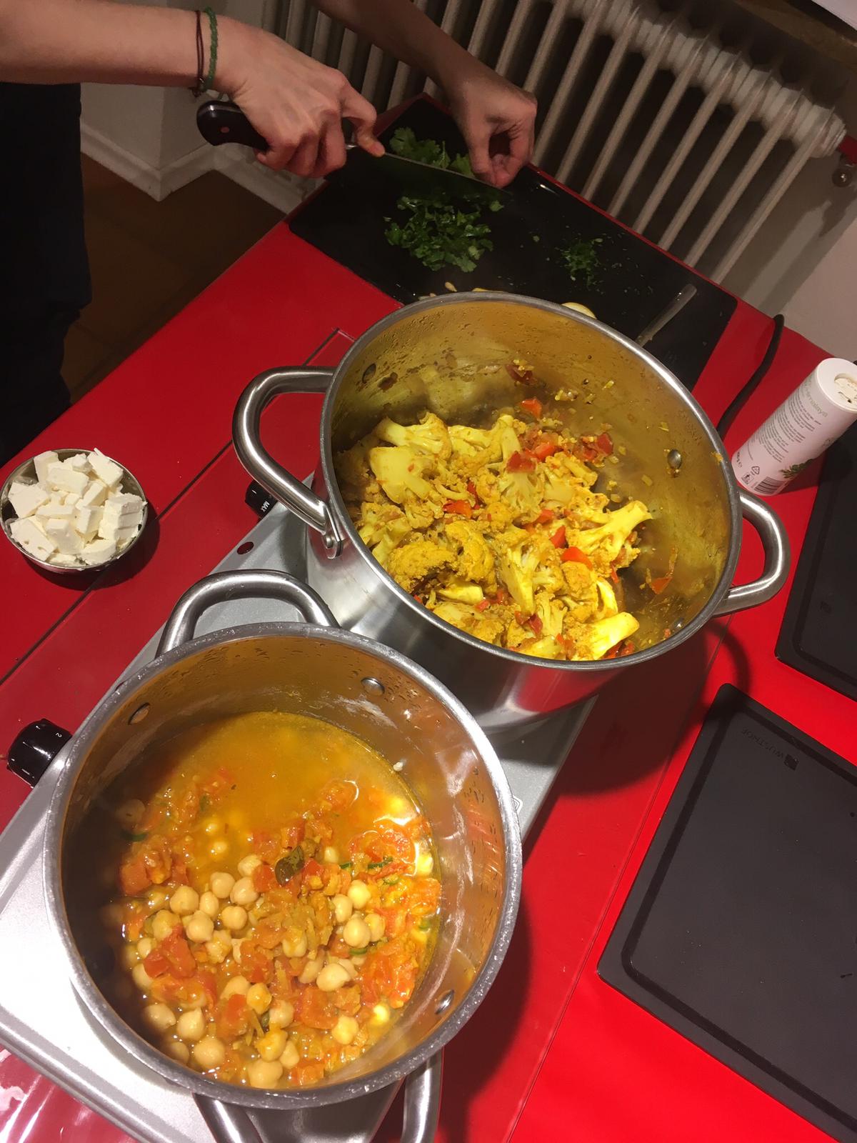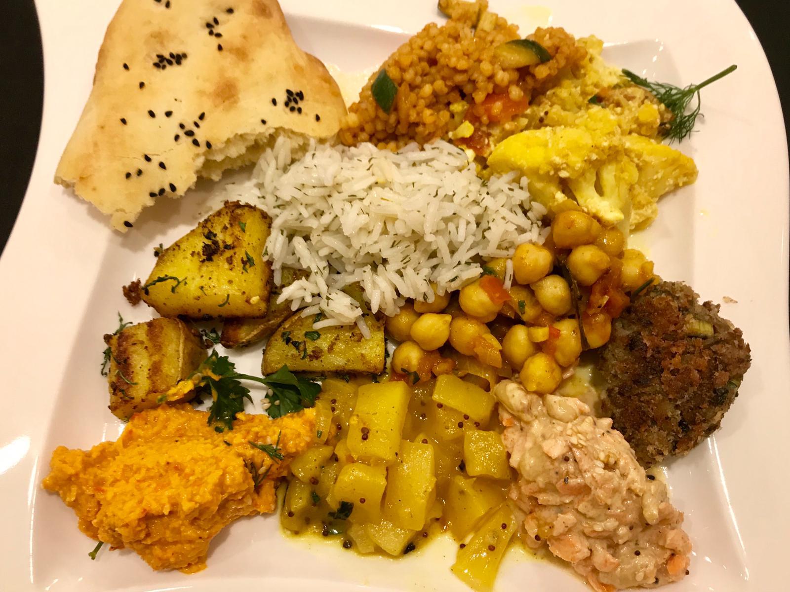 Pilzküchlein, Paprika-Kartoffelcurry mit Dillreis, dazu ein scharfes Kichererbsencurry auf Gersten-Bulgur, grünes