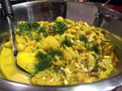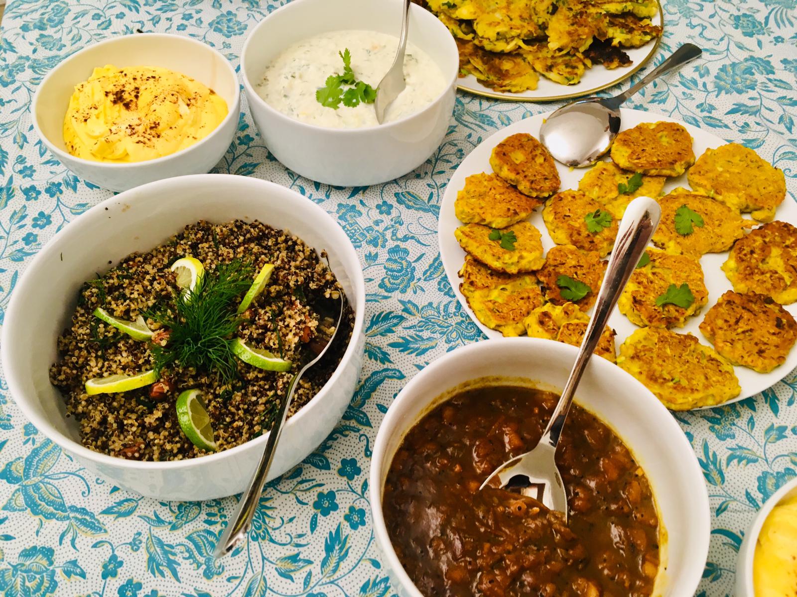 Pilzküchlein, Paprika-Kartoffelcurry mit Dillreis, dazu ein scharfes Kichererbsencurry auf Gersten-Bulgur, grünes