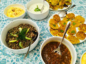 Frühlingsgemüse vom Blech, Kokosnuss- und Mango Chutney mit frisch gebackenem Naan vom Grill, Karotten-Erdnuss Raita